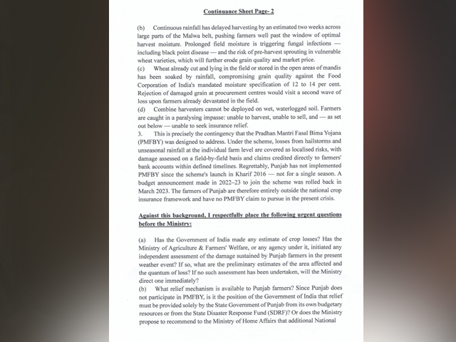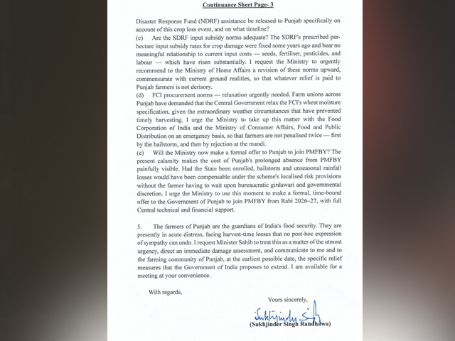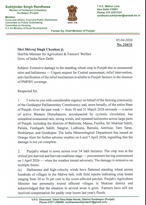 गुरदासपुर, 5 अप्रैल - गुरदासपुर से सांसद और पंजाब कांग्रेस के सीनियर नेता सुखजिंदर सिंह रंधावा ने केंद्रीय कृषि मंत्री शिवराज सिंह चौहान को पत्र लिखकर मांग की है कि वेस्टर्न डिस्टर्बेंस के कारण पंजाब में हुई बेमौसम बारिश से किसानों की फसलों को काफी नुकसान हुआ है। इसलिए केंद्र को इस मुश्किल समय में दखल देकर किसानों को राहत देनी चाहिए।