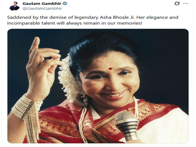 नई दिल्ली, 12 अप्रैल - भारतीय क्रिकेट टीम के हेड कोच गौतम गंभीर ने मशहूर सिंगर आशा भोसले के निधन पर शोक जताया।