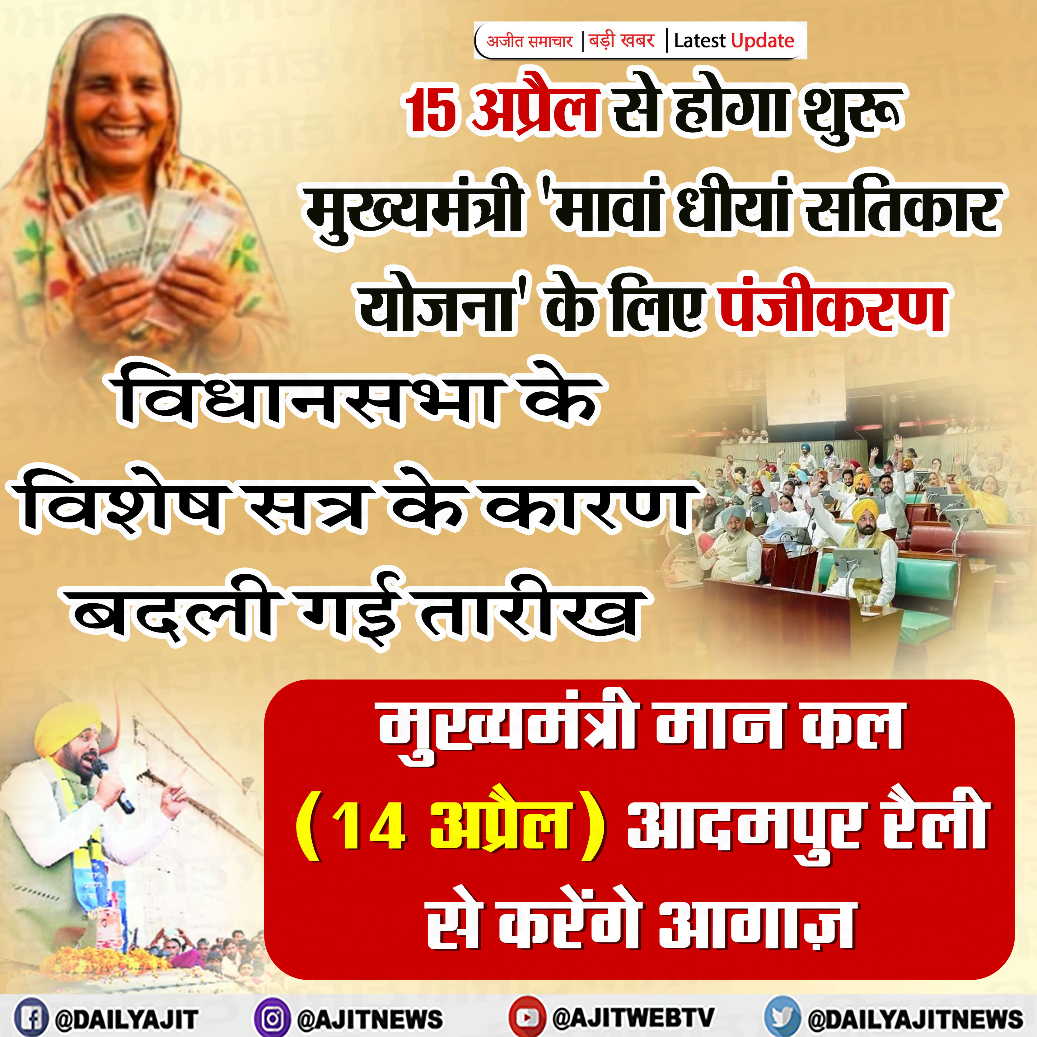 चंडीगढ़, 13 अप्रैल- पंजाब में मुख्यमंत्री 'मावां धीयां सतिकार योजना' के लिए पंजीकरण अब 15 अप्रैल से शुरू होगा। मुख्यमंत्री भगवंत मान कल 14 अप्रैल को आदमपुर रैली में इसका शुभारंभ करेंगे। यह योजना मुक्तसर, रोपड़, पटियाला, संगरूर, मोगा, जालंधर और फरीदकोट सहित 7 जिलों में शुरू की जाएगी।