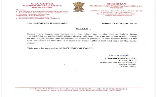 AAP ने अपने राज्यसभा सांसदों को 16 अप्रैल से 18 अप्रैल तक सदन में मौजूद रहने के लिए व्हिप किया जारी