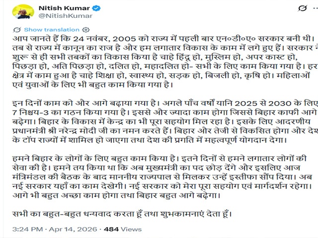 कुछ देर में मुख्यमंत्री नीतीश कुमार अपना इस्तीफा देने के लिए राजभवन जाएंगे। भाजपा के राष्ट्रीय अध्यक्ष नितिन नवीन, दोनों डिप्टी सीएम सम्राट चौधरी और विजय सिन्हा के साथ सीएम हाउस पहुंचे हैं।