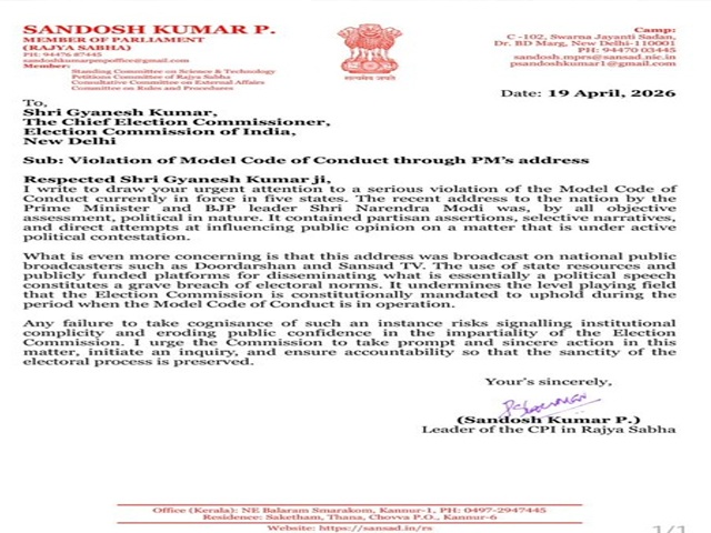 तिरुवनंतपुरम, 19 अप्रैल - केरल से सीपीआई के राज्यसभा सदस्य पी संदोश कुमार ने प्रधानमंत्री के भाषण से आदर्श आचार संहिता के उल्लंघन को लेकर मुख्य चुनाव आयुक्त ज्ञानेश कुमार को पत्र लिखा है। पत्र में उन्होंने लिखा, "प्रधानमंत्री और भाजपा नेता नरेंद्र मोदी का राष्ट्र के नाम हालिया संबोधन, सभी वस्तुनिष्ठ आकलनों के अनुसार, राजनीतिक प्रकृति का था। इसमें पक्षपातपूर्ण दावे, चुनावी आख्यान और ऐसे मामले पर जनता की राय को प्रभावित करने के प्रत्यक्ष प्रयास शामिल थे।" ऐसे प्रयास थे जो सक्रिय राजनीतिक प्रतिस्पर्धा के अधीन थे।"