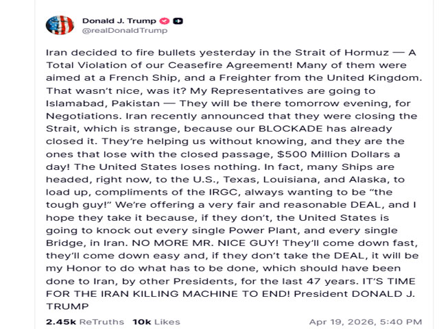 वाशिंगटन, डी.सी, 19 अप्रैल - अमेरिका के राष्ट्रपति डोनाल्ड ट्रंप ने अपने ट्रुथ सोशल पर पोस्ट किया, "ईरान ने कल होर्मुज स्ट्रेट में गोलियां चलाने का फैसला किया जो हमारे सीजफायर एग्रीमेंट का पूरी तरह से उल्लंघन है! उनमें से कई गोलियां एक फ्रेंच शिप और यूनाइटेड किंगडम के एक फ्रेटर पर निशाना साधकर चलाई गईं। यह अच्छा नहीं था। मेरा प्रतिनिधिमंडल इस्लामाबाद, पाकिस्तान जा रहा है। वे कल शाम बातचीत के लिए वहां होंगे... हम एक बहुत ही एक बहुत ही निष्पक्ष और वाजिब डील का प्रस्ताव दे रहे हैं, और मुझे उम्मीद है कि वे इसे मान लेंगे क्योंकि, अगर वे ऐसा नहीं करते हैं, तो यूनाइटेड स्टेट्स ईरान में हर एक पावर प्लांट और हर एक ब्रिज को खत्म कर देगा।