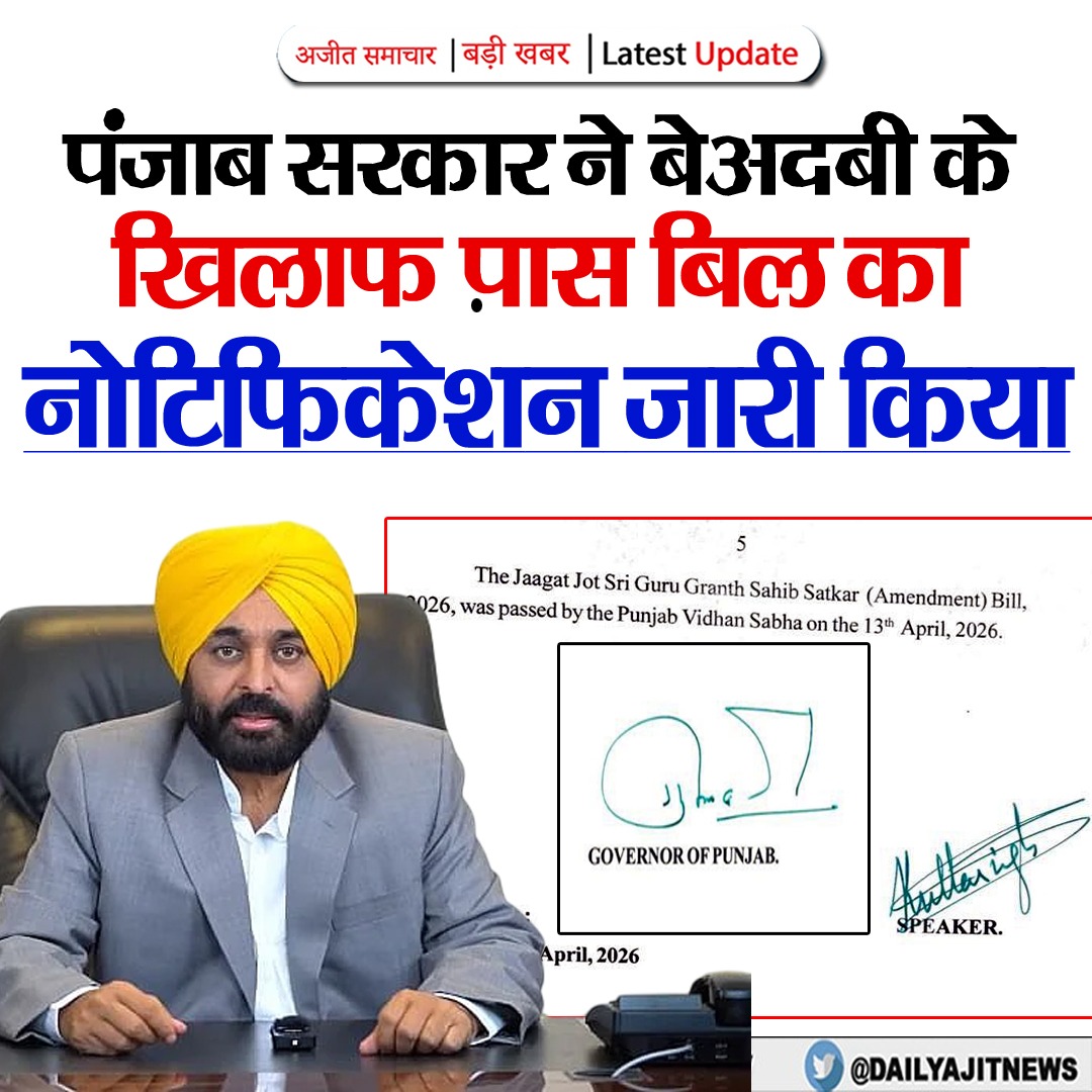पंजाब के मुख्यमंत्री भगवंत सिंह मान ने रविवार को ऐलान किया था कि श्री गुरु ग्रंथ साहिब की बेअदबी के खिलाफ पंजाब विधानसभा में पास हुआ बिल राज्यपाल की मंजूरी मिलने के बाद अब आधिकारिक तौर पर कानून बन गया है। यह पवित्र ग्रंथ की मर्यादा की रक्षा करने के लिए एक ज़रूरी कानूनी कदम है।