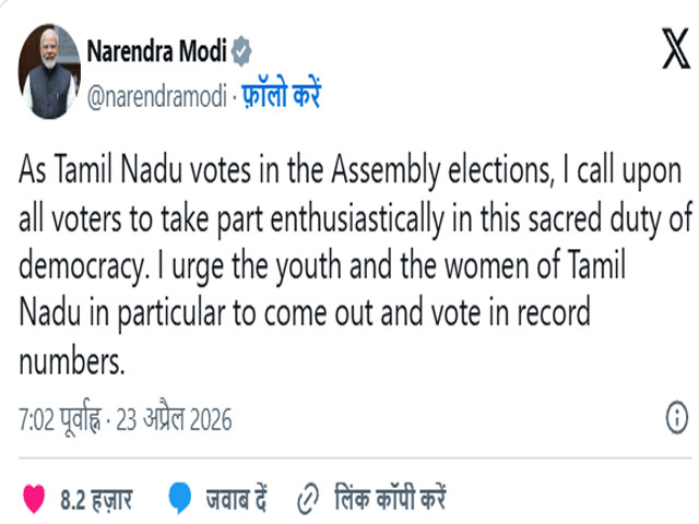 नई दिल्ली, 23 अप्रैल - तमिलनाडु में विधानसभा चुनाव के लिए मतदान शुरू होने पर प्रधानमंत्री मोदी ने राज्य की जनता से मतदान की अपील की है। पीएम मोदी ने एक्स पर एक पोस्ट में लिखा- तमिलनाडु में विधानसभा चुनाव के लिए मतदान हो रहा है, ऐसे में मैं सभी मतदाताओं से लोकतंत्र के इस पवित्र कर्तव्य में उत्साहपूर्वक भाग लेने का आह्वान करता हूं। मैं विशेष रूप से तमिलनाडु के युवाओं और महिलाओं से आग्रह करता हूं कि वे बड़ी संख्या में मतदान करने के लिए आगे आएं।