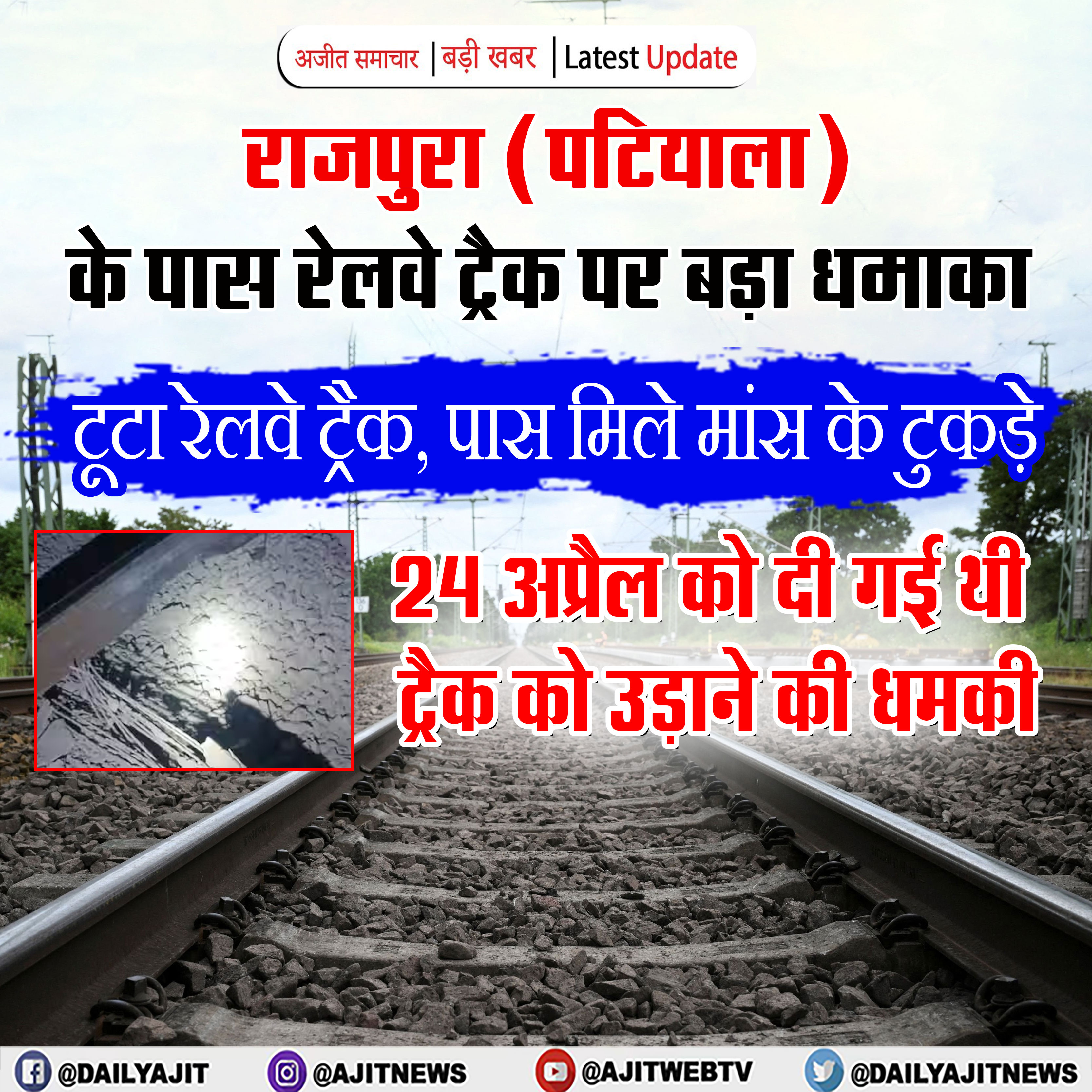 राजपुरा (पटियाला), 28 अप्रैल (धरमिंदर सिंह) – सोमवार रात राजपुरा में गांव बिठौनिया के पास अंबाला-अमृतसर रेल फ्रंट कॉरिडोर लाइन पर IED ब्लास्ट हुआ। यह घटना रात करीब 8:30 बजे राजपुरा-शंभू रेलवे स्टेशन के पास हुई। सूचना मिलने पर GRP, RPF, पंजाब पुलिस और दूसरी जांच एजेंसियां मौके पर पहुंचीं और जांच शुरू कर दी।