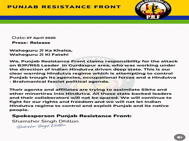 चंडीगढ़, 28 अप्रैल - पंजाब अपोज़िशन फ्रंट ने गुरदासपुर में BJP/RSS नेता पर हुए हमले की ज़िम्मेदारी ली है। फ्रंट के प्रवक्ता शमशेर सिंह ढिल्लों ने सोशल मीडिया पर एक पोस्ट में कहा कि सिखों और दूसरी माइनॉरिटी को हिंदुत्व में शामिल करने की कोशिश की जा रही है। ऐसा करने वालों और उनके साथियों को बख्शा नहीं जाएगा। हम अपने हक और आज़ादी के लिए लड़ते रहेंगे।