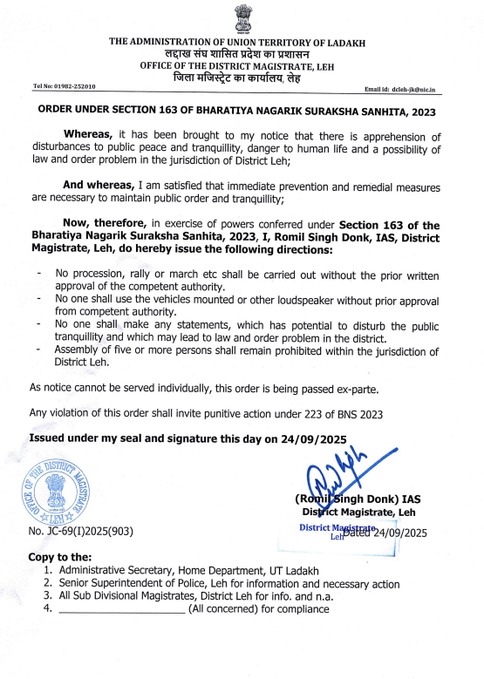 लेह, 24 सितंबर - ज़िले में 5 या अधिक व्यक्तियों के एकत्र होने पर प्रतिबंध लगा दिया गया है; राज्य का दर्जा देने की मांग कर रहे स्थानीय लोगों के विरोध प्रदर्शन के बाद जिला मजिस्ट्रेट के आदेश के अनुसार लेह में पूर्व लिखित अनुमति के बिना कोई जुलूस, रैली या मार्च नहीं निकाला जाएगा।