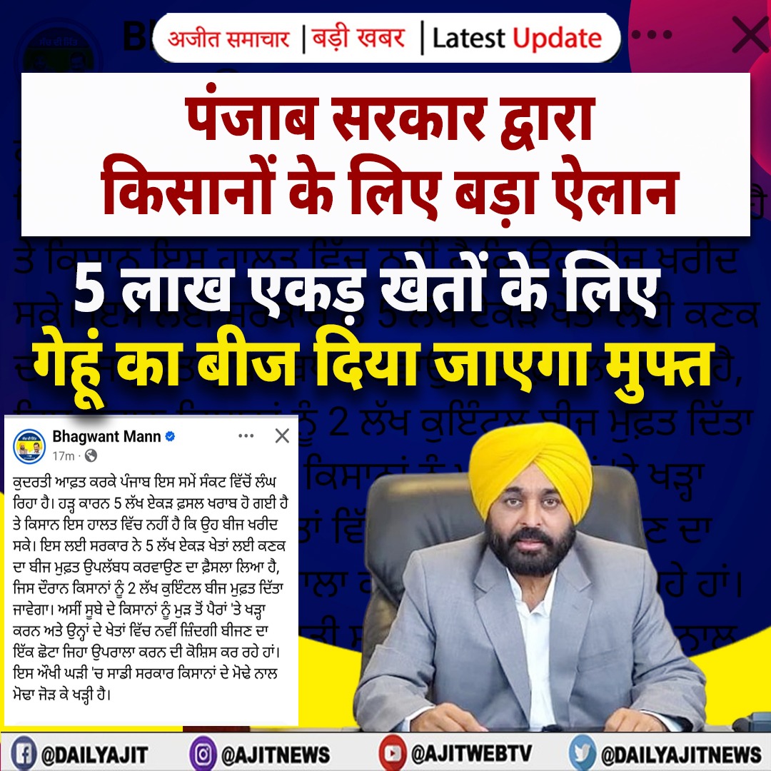#राज्य सरकार ने 5 लाख एकड़ खेतों के लिए मुफ़्त गेहूं के बीज उपलब्ध कराने का फ़ैसला किया - सीएम मान