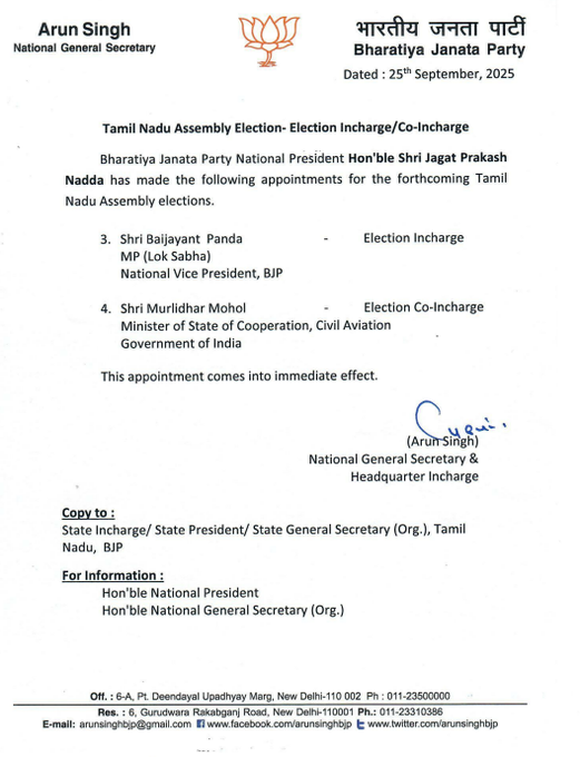 नई दिल्ली, 25 सितंबर - भाजपा ने पार्टी नेता बैजयंत पांडा को तमिलनाडु चुनाव प्रभारी नियुक्त किया है। मुरलीधर मोहोल को तमिलनाडु चुनाव सह-प्रभारी नियुक्त किया गया।