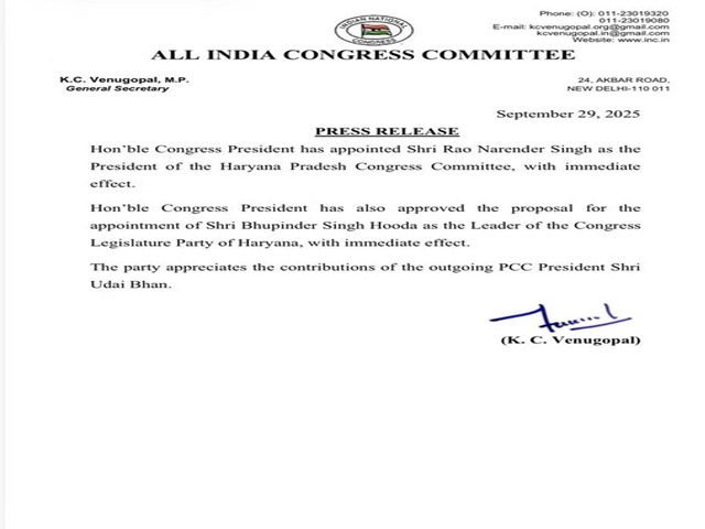 नई दिल्ली, 29 सितंबर - कांग्रेस पार्टी ने हरियाणा के लिए अपने प्रदेश अध्यक्ष के नाम की घोषणा कर दी है। कांग्रेस पार्टी की ओर से दी गई जानकारी के अनुसार, राव नरेंद्र सिंह को हरियाणा प्रदेश कांग्रेस कमेटी का अध्यक्ष नियुक्त किया गया है। राव नरेंद्र सिंह हरियाणा कांग्रेस के वर्तमान अध्यक्ष उदय भान की जगह लेंगे। इसके अलावा, कांग्रेस पार्टी ने हरियाणा के पूर्व मुख्यमंत्री भूपेंद्र सिंह हुड्डा को भी बड़ी ज़िम्मेदारी सौंपी है। भूपेंद्र सिंह हुड्डा को हरियाणा कांग्रेस विधायक दल का नेता नियुक्त किया गया है।