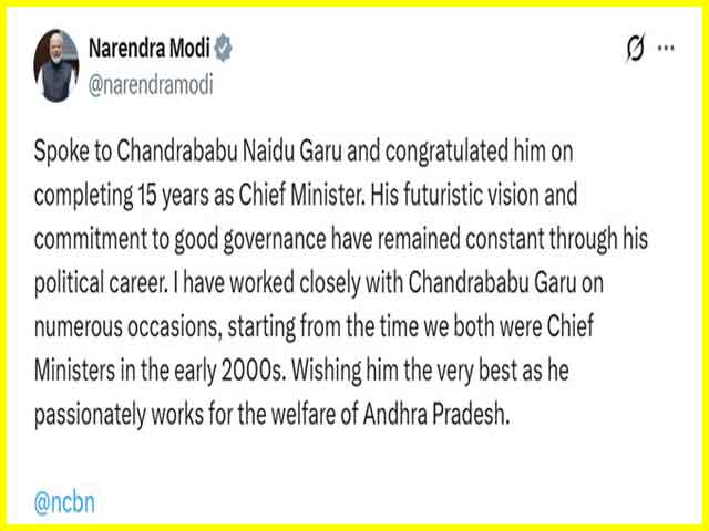 #PM Modi ने आंध्र प्रदेश के मुख्यमंत्री चंद्रबाबू नायडू को मुख्यमंत्री के रूप में 15 साल पूरे करने पर बधाई दी