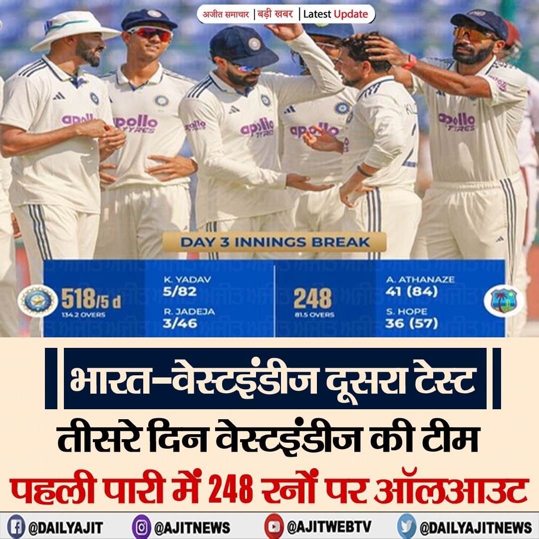 भारत-वेस्टइंडीज दूसरा टेस्ट: तीसरे दिन वेस्टइंडीज की टीम पहली पारी में 248 रनों पर ऑलआउट