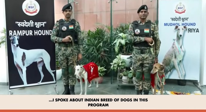 बीएसएफ का राष्ट्रीय कुत्ता प्रशिक्षण केंद्र ग्वालियर के टेकनपुर में स्थित है। यहाँ उत्तर प्रदेश के रामपुर हाउंड और कर्नाटक व महाराष्ट्र के मुधोल हाउंड पर विशेष ध्यान दिया जा रहा है। बेंगलुरु स्थित सीआरपीएफ के डॉग ब्रीडिंग एंड ट्रेनिंग स्कूल में मोंगरेल, मुधोल हाउंड, कोम्बाई और पांडिकोना जैसी भारतीय नस्लों के कुत्तों को प्रशिक्षित किया जा रहा है।" पिछले साल लखनऊ में आयोजित ऑल इंडिया पुलिस ड्यूटी मीट में रिया नाम की एक कुतिया ने सबका ध्यान अपनी ओर खींचा था। वह BSF द्वारा प्रशिक्षित मुधोल हाउंड नस्ल की कुतिया है। रिया ने कई विदेशी नस्लों को पछाड़ते हुए वहाँ प्रथम पुरस्कार जीता था। हमारे स्वदेशी कुत्तों ने भी अद्भुत साहस दिखाया है। पिछले साल छत्तीसगढ़ के एक माओवाद प्रभावित इलाके में गश्त के दौरान CRPF के एक स्वदेशी कुत्ते ने 8 किलो विस्फोटक का पता लगाया था। मैं इस दिशा में किए गए प्रयासों के लिए BSF और CRPF को बधाई देता हूँ।