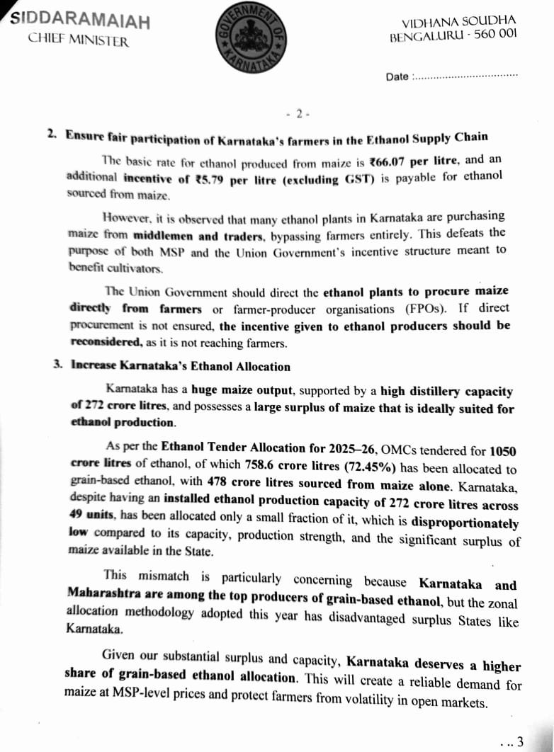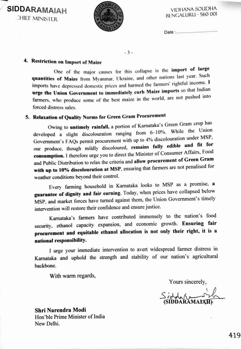बेंगलुरु, 22 नवंबर - कर्नाटक के मुख्यमंत्री सिद्धारमैया ने प्रधानमंत्री नरेंद्र मोदी को एक लेटर लिखा है। कर्नाटक के मुख्यमंत्री सिद्धारमैया ने प्रधानमंत्री नरेंद्र मोदी को एक लेटर लिखा है। लेटर में, उन्होंने केंद्र सरकार से रिक्वेस्ट की है कि "NAFED, FCI और NCCF के ज़रिए MSP पर खरीद शुरू की जाए, यह पक्का किया जाए कि इथेनॉल प्लांट सीधे किसानों से मक्का खरीदें, कर्नाटक का इथेनॉल एलोकेशन बढ़ाया जाए, किसानों को मौसम के ज़रूरी असर से बचाने के लिए मूंग की क्वालिटी के नियमों में ढील दी जाए, और उन मामलों में केंद्र सरकार के दखल की मांग की है जिन्हें सिर्फ़ केंद्र सरकार ही सुलझा सकती है।"
