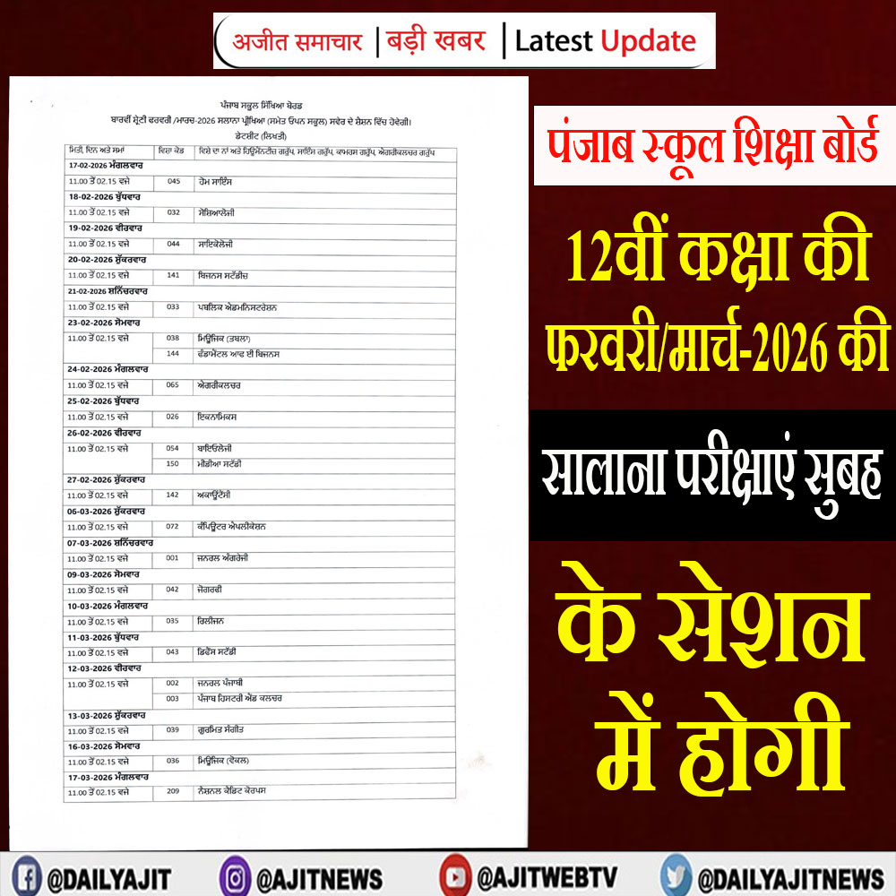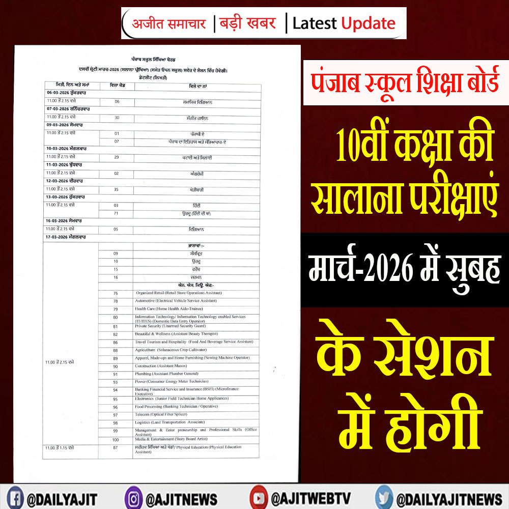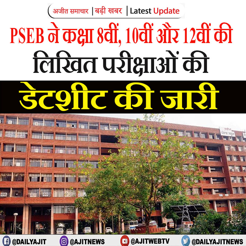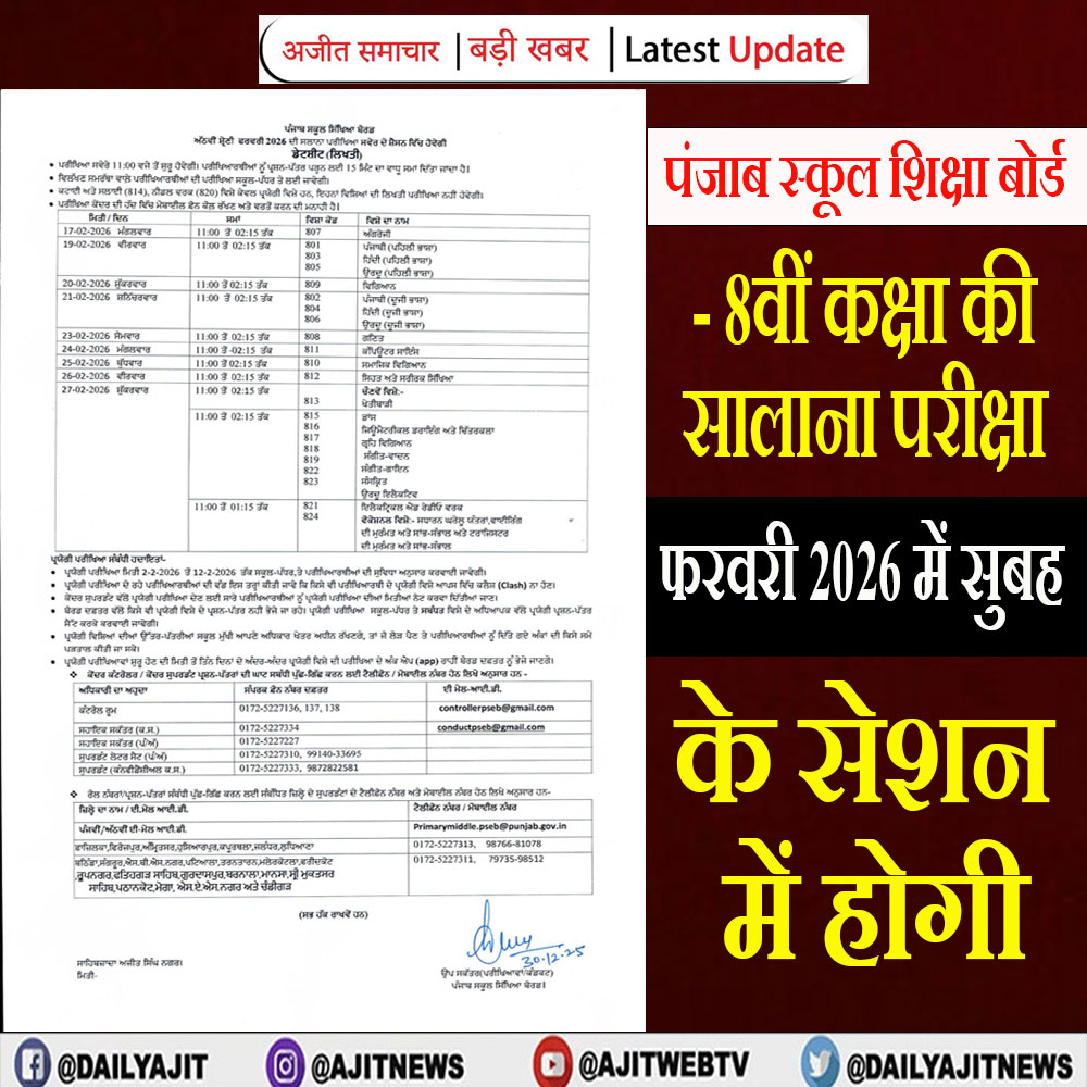 पंजाब स्कूल शिक्षा बोर्ड (PSEB) ने कक्षा 8वीं, 10वीं और 12वीं की लिखित परीक्षाओं की डेटशीट जारी कर दी है। बोर्ड द्वारा जारी आदेश के अनुसार परीक्षाएं साल 2026 में निर्धारित तिथियों पर आयोजित की जाएंगी। 8वीं-12वीं की 17 फरवरी और 10वीं की परीक्षाएं 6 मार्च से शुरू होंगी