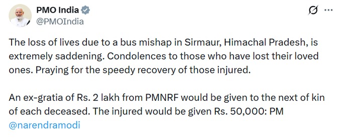 सिरमौर बस हादसा: PMO ने मृतक के परिवार को 2 लाख का मुआवज़ा देने की घोषणा की