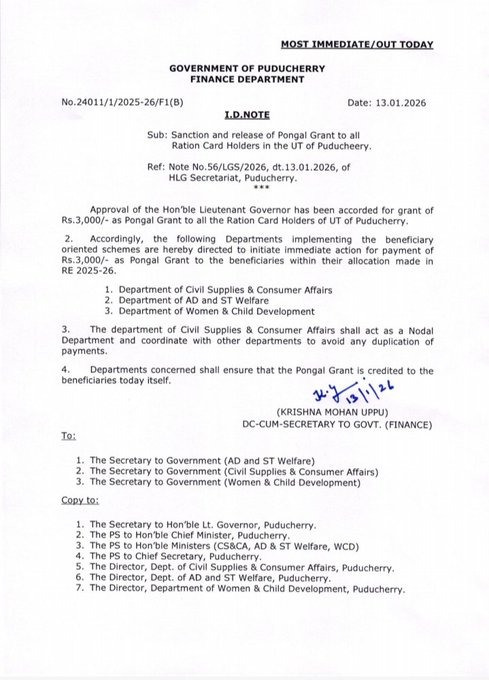 पुडुचेरी उपराज्यपाल द्वारा राशन कार्ड धारकों को पोंगल ग्रांट के तौर पर 3,000 देने की मंज़ूरी