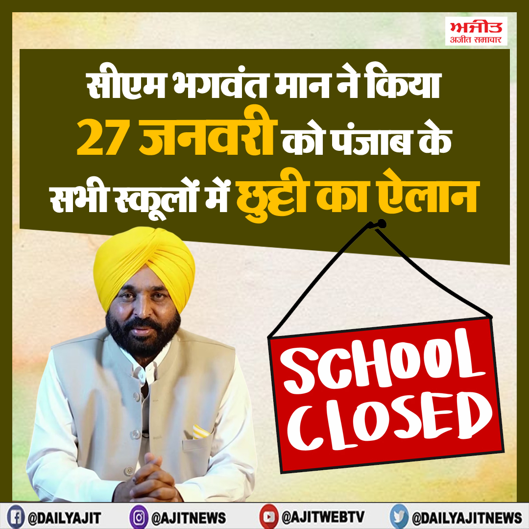 पंजाब के सभी स्कूलों में 27 जनवरी की छुट्टी का ऐलान कर दिया गया है, पंजाब के सीएम भगवंत मान ने होशियारपुर में झंडा फहराने के दौरान ये ऐलान किया है।
