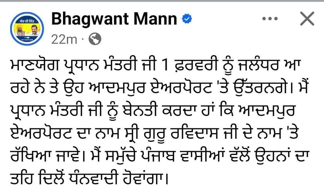 आदमपुर एयरपोर्ट का नाम श्री गुरु रविदास जी के नाम पर रखा जाए - भगवंत मान