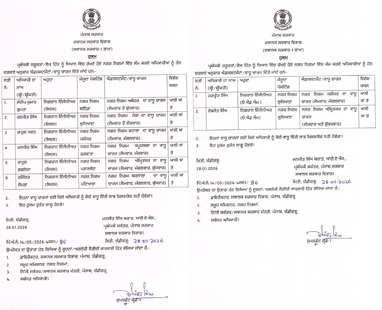 चंडीगढ़, 28 जनवरी- स्थानीय निकाय विभाग ने निगम में काम करने वाले अधिकारियों को अतिरिक्त प्रभार दिया है। देखें पूरी जानकारी...