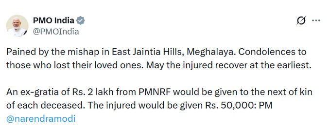 मेघालय दर्दनाक हादसा: PMO द्वारा मृतक के परिवार को 2 लाख अनुग्रह राशि देने की घोषणा