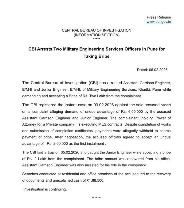 नई दिल्ली, 6 फरवरी - CBI ने पुणे में रिश्वत लेने के आरोप में मिलिट्री इंजीनियरिंग सर्विसेज़ के दो अधिकारियों को गिरफ्तार किया।
