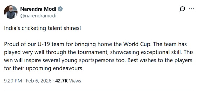 नई दिल्ली, 6 फरवरी - प्रधानमंत्री नरेंद्र मोदी ने ट्वीट किया, "भारत का क्रिकेट टैलेंट चमका! वर्ल्ड कप घर लाने के लिए हमारी U-19 टीम पर गर्व है। टीम ने पूरे टूर्नामेंट में बहुत अच्छा खेला, शानदार कौशल दिखाया। यह जीत कई युवा खिलाड़ियों को भी प्रेरित करेगी। खिलाड़ियों को उनके आने वाले प्रयासों के लिए शुभकामनाएं।
