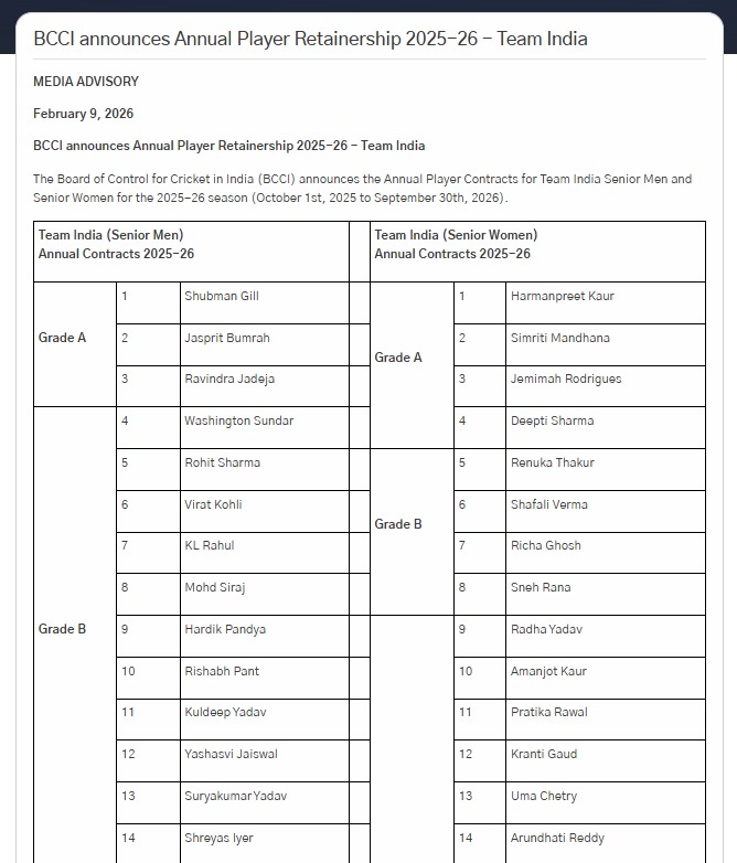नई दिल्ली, 9 फरवरी - BCCI ने 2025-26 सीज़न (1 अक्टूबर, 2025 से 30 सितंबर, 2026) के लिए टीम इंडिया सीनियर पुरुष और सीनियर महिला खिलाड़ियों के सालाना कॉन्ट्रैक्ट की घोषणा की है। ग्रेड A - शुभमन गिल, जसप्रीत बुमराह, रवींद्र जडेजा, हरमनप्रीत कौर, स्मृति मंधाना, जेमिमा रोड्रिग्स, दीप्ति शर्मा रोहित शर्मा और विराट कोहली ग्रेड B में