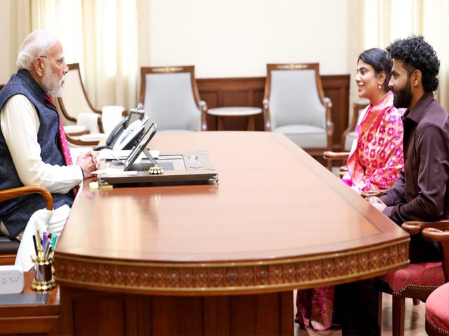 नई दिल्ली - क्रिकेटर रवींद्र जडेजा ने अपनी पत्नी के साथ प्रधानमंत्री नरेंद्र मोदी से की मुलाकात