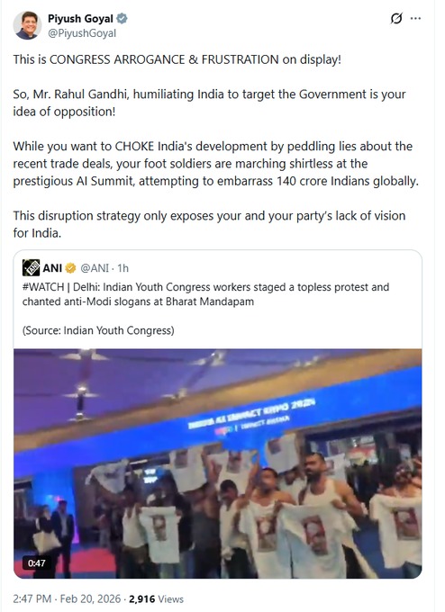 नई दिल्ली, 20 फरवरी - AI इम्पैक्ट समिट में इंडियन यूथ कांग्रेस के वर्कर्स के प्रोटेस्ट पर, केंद्रीय मंत्री पीयूष गोयल ने ट्वीट किया, "यह कांग्रेस का घमंड और फ्रस्ट्रेशन दिखा रहा है! तो, मिस्टर राहुल गांधी, सरकार को टारगेट करने के लिए इंडिया को बेइज्जत करना ही आपका अपोज़िशन है! जहां आप हाल के ट्रेड डील्स के बारे में झूठ फैलाकर इंडिया के डेवलपमेंट को रोकना चाहते हैं, वहीं आपके फुट सोल्जर्स मशहूर AI समिट में शर्टलेस मार्च कर रहे हैं और दुनिया भर में 140 करोड़ इंडियंस को शर्मिंदा करने की कोशिश कर रहे हैं। यह रुकावट डालने की स्ट्रैटेजी सिर्फ़ इंडिया के लिए आपके और आपकी पार्टी के विज़न की कमी को दिखाती है।