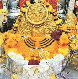 मंदिर से पूर्व पैड़ियानुमा चढ़ाई है। उसके बाद गली आती है। मंदिर का मुख्य द्वार बड़ा है। मंदिर के सिंहद्वार के पूर्व दायी-बायीं ओर दो छोटे-छोटे मंदिर हैं। प्रवेश करने पर संगमरमर की कुछ पैड़ियां उतरनी पड़ती हैं। इस मंदिर की यह विशेषता है कि इस मंदिर के ऊपर मस्जिद, गुरुद्वारा व मंदिर के प्रतीक चिन्ह ऊपर गुम्बद के पास बने हुए हैं। भक्तों को पंक्तिबद्ध रखने के लिए मंदिर परिसर में रेलिंग है। माता के दर्शन पिंडी के रूप में हैं। माता के सामने बड़ी-बड़ी आकृति में चार संगमरमर के शेर बने हैं।