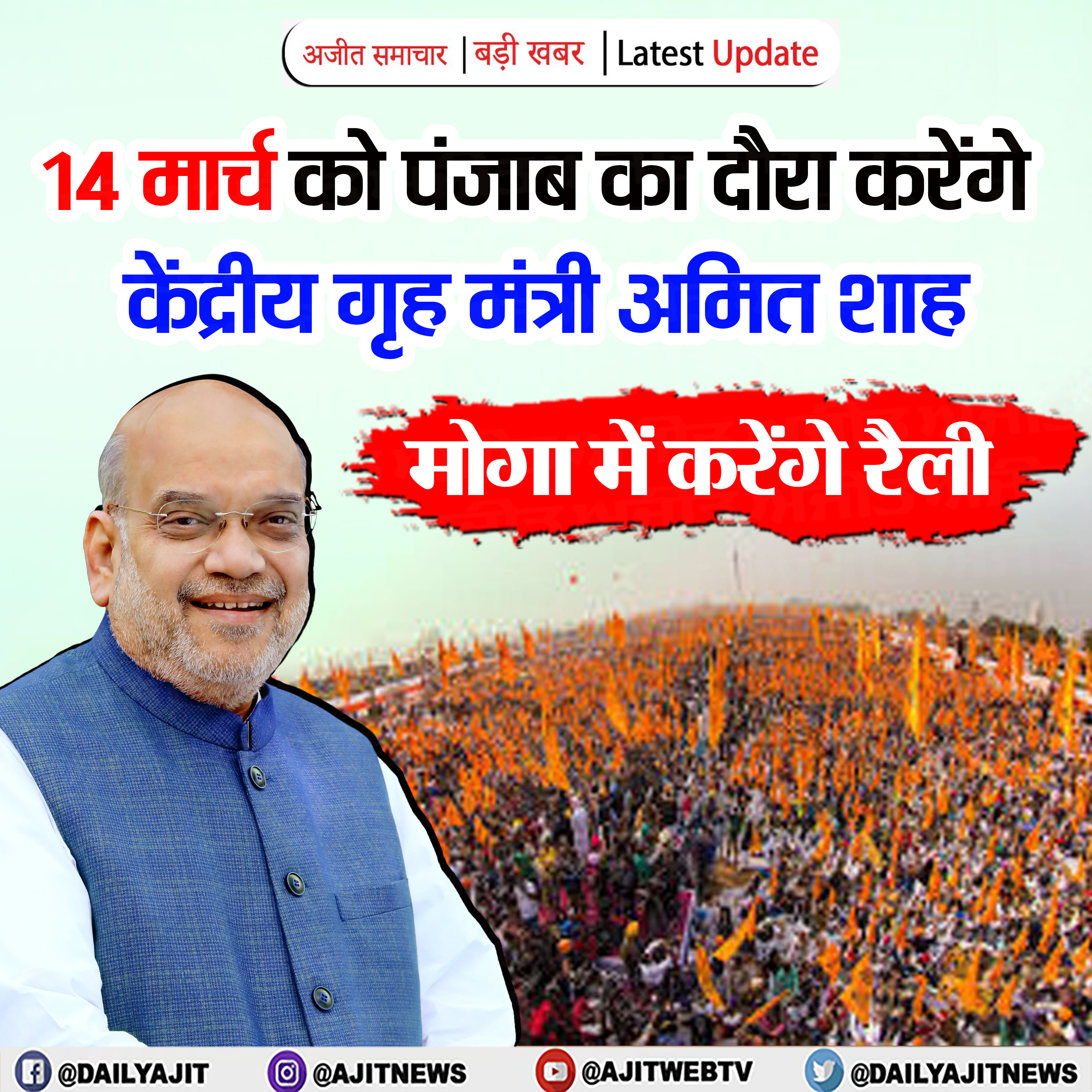 नई दिल्ली, 26 फरवरी- गृह मंत्री अमित शाह 14 मार्च को पंजाब का दौरा करेंगे। गृह मंत्री अमित शाह की पंजाब रैली को आने वाले 2027 के विधानसभा चुनावों के मद्देनजर अहम माना जा रहा है। यह रैली मोगा गांव से शुरू होगी, जहां से आम आदमी पार्टी ने अपना कैंपेन शुरू किया था।