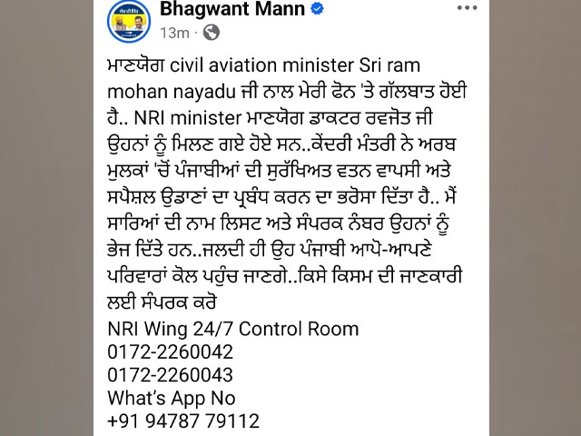 मुख्यमंत्री ने कहा कि उन्होंने सभी के नाम, लिस्ट और कॉन्टैक्ट नंबर उन्हें भेज दिए हैं। जल्द ही वे पंजाबी अपने-अपने परिवारों के पास पहुंच जाएंगे। किसी भी तरह की जानकारी के लिए इन नंबरों पर संपर्क किया जा सकता है: NRI विंग 24/7 कंट्रोल रूम 0172-2260042, 0172-2260043 और WhatsApp नंबर +91 94787 79112