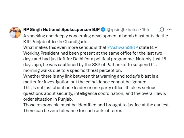 चंडीगढ़, 2 अप्रैल - चंडीगढ़ में BJP ऑफिस के बाहर हुए ब्लास्ट के बारे में नेशनल स्पोक्सपर्सन आर.पी. सिंह ने एक पोस्ट शेयर की है। उन्होंने कहा कि पंजाब ऑफिस के बाहर हुआ बम ब्लास्ट एक चौंकाने वाली और बहुत चिंताजनक घटना है। उन्होंने कहा कि यह और भी गंभीर बात है कि BJP के प्रदेश वर्किंग प्रेसिडेंट अश्विनी शर्मा पिछले दो दिनों से उसी ऑफिस में मौजूद थे और एक पॉलिटिकल प्रोग्राम के लिए दिल्ली गए थे। गौरतलब है कि सिर्फ 15 दिन पहले पठानकोट के SSP ने उन्हें एक खास खतरे के चलते मॉर्निंग वॉक रोकने की चेतावनी दी थी।