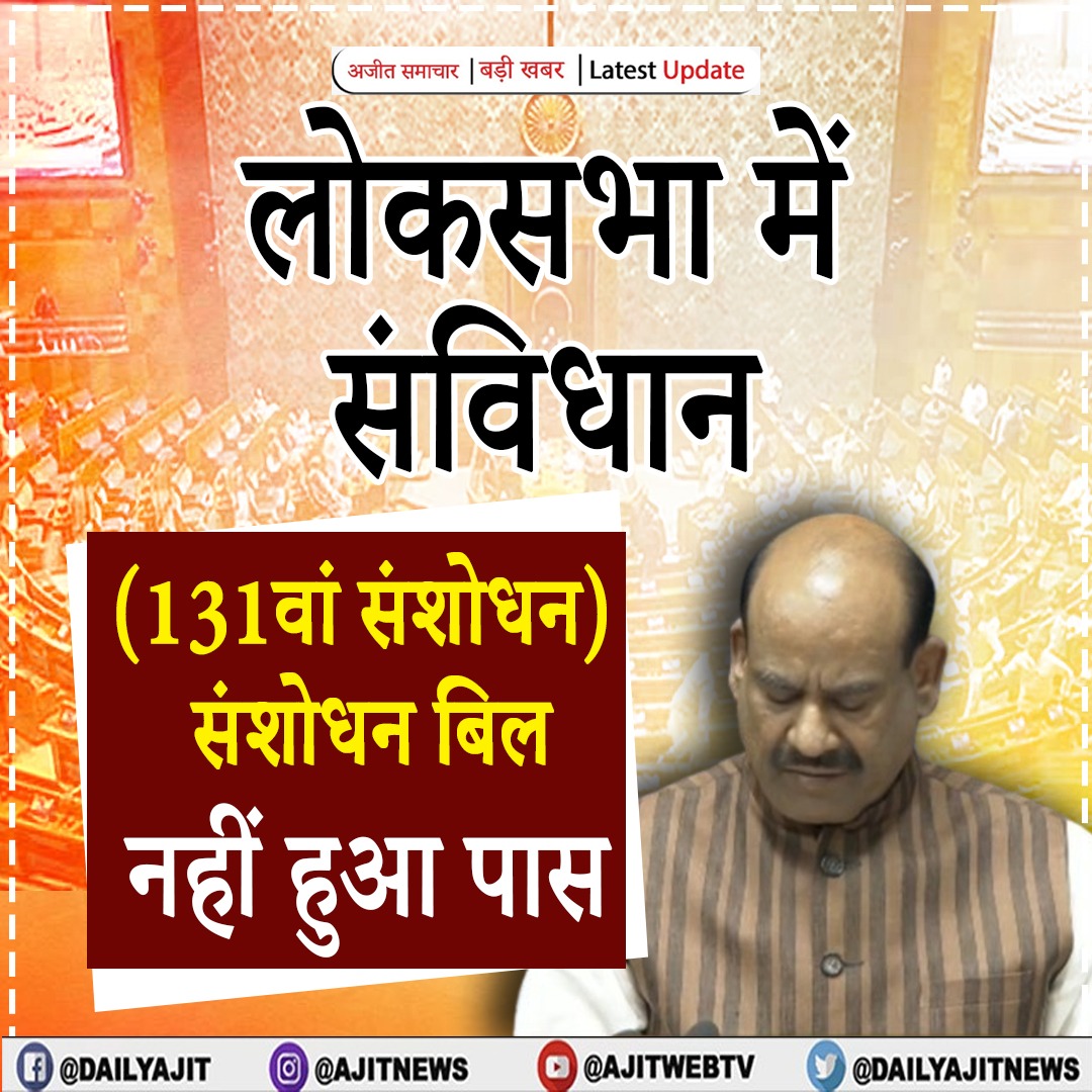 नई दिल्ली, 17 अप्रैल - लोकसभा स्पीकर ओम बिरला ने कहा, "संविधान (131वां संशोधन) संशोधन बिल पास नहीं हुआ क्योंकि सदन में वोटिंग के दौरान इसे 2/3 बहुमत नहीं मिला।"