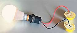 यह सिलसिला हर नींबू के साथ जारी रखेंगे, जब तक कि अंतिम पैनी पर न आ जाएं। इस पैनी से क्लिप का एक सिरा जोड़ेंगे और दूसरे को बिना जुड़े रहने देंगे। अब हमारे पास दो बिना जुड़े सिरे हैं। यह कार के जम्पर केबल की तरह हैं। इन्हें आपस में मत मिलाना। बिना जुड़े केबल को एलईडी लाइट के एक तार से जोड़ दें। जब आप दूसरे बिना जुड़े केबल को एलईडी लाइट के दूसरे तार से जोड़ेंगे तो आपको बल्ब जलता हुआ दिखायी देगा। लो नींबुओं से बल्ब जल गया।