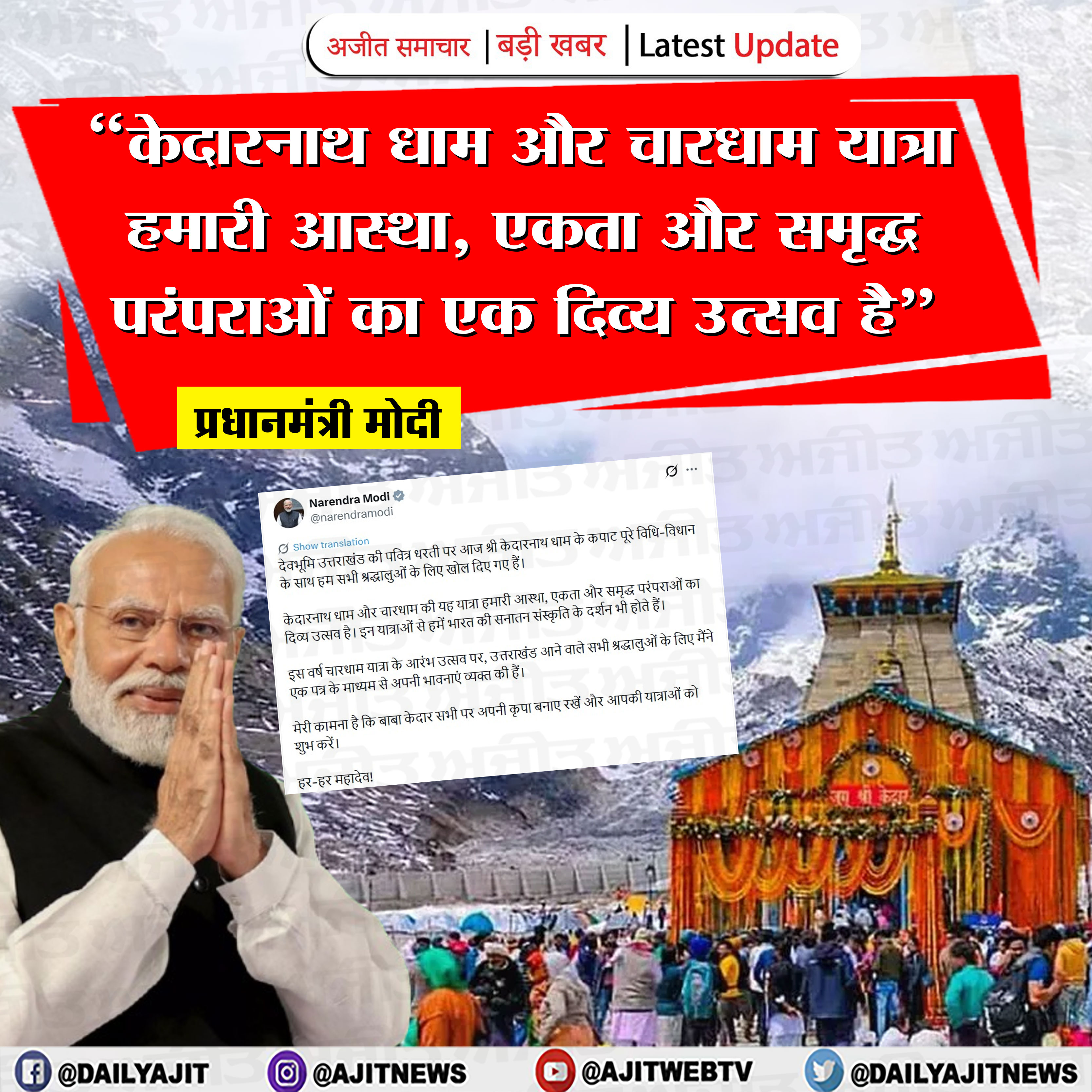 नई दिल्ली, 22 अप्रैल - प्रधानमंत्री नरेंद्र मोदी ने केदारनाथ धाम के कपाट खुलने पर ट्वीट किया है। उन्होंने कहा कि आज देवभूमि उत्तराखंड की पावन धरती पर पूरे विधि-विधान के साथ श्री केदारनाथ धाम के कपाट भक्तों के लिए खोल दिए गए हैं। केदारनाथ धाम और चार धाम की यह यात्रा हमारी आस्था, एकता और समृद्ध परंपराओं का एक दिव्य उत्सव है। इन यात्राओं के माध्यम से हमें भारत की सनातन संस्कृति की झलक भी मिलती है। इस साल चार धाम यात्रा शुरू होने के अवसर पर मैंने उत्तराखंड आने वाले सभी भक्तों को एक पत्र के माध्यम से अपनी भावनाएं व्यक्त की हैं। मेरी कामना है कि बाबा केदार सभी पर अपनी कृपा बनाए रखें और आपकी यात्रा को मंगलमय बनाएं।