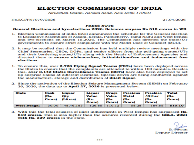 नई दिल्ली, 27 अप्रैल - 2026 के पश्चिम बंगाल विधानसभा चुनावों को लेकर चुनाव आयोग की सख्ती का असर अब साफ़ दिख रहा है। राज्य में चल रहे खास अभियान के दौरान अब तक 510 करोड़ रुपये से ज़्यादा का गैर-कानूनी कैश, शराब, ड्रग्स, कीमती धातुएं और मुफ़्त चीज़ें ज़ब्त की जा चुकी हैं। यह आंकड़ा 2021 के विधानसभा चुनावों से काफ़ी ज़्यादा है। 2021 में, कुल ज़ब्तियां लगभग 339 करोड़ रुपये तक ही सीमित थीं।