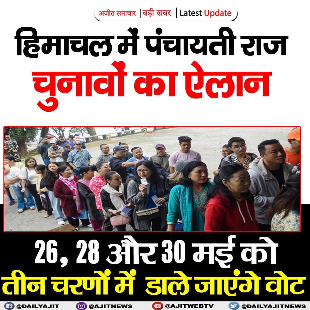 हिमाचल में पंचायती राज चुनावों का ऐलान , 26, 28 और 30 मई को तीन चरणों में डाले जाएंगे वोट
